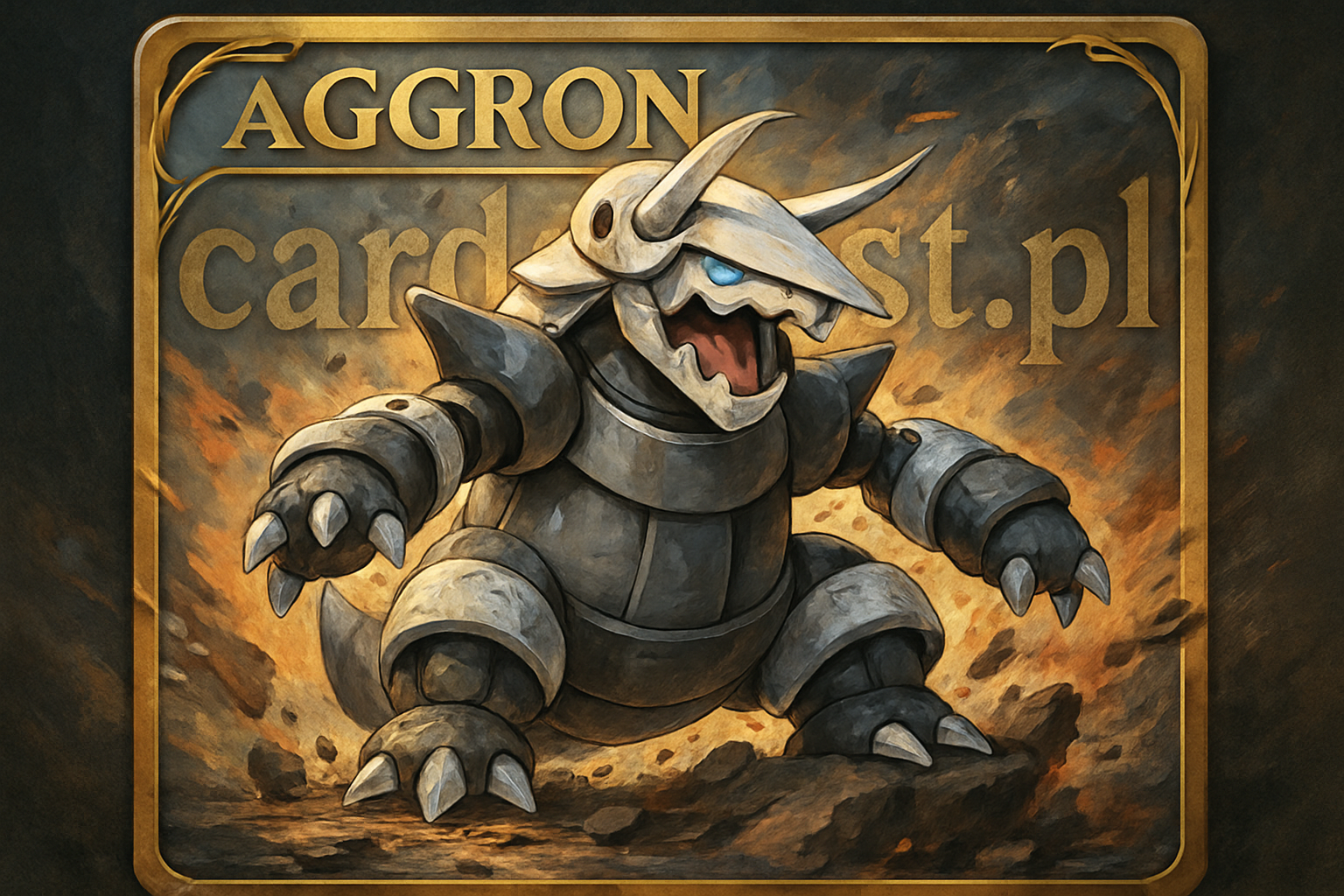 Aggron, wprowadzony w regionie Hoenn, to potężny Pokémon typu Stal/Kamień, który jest świetnym przykładem na to, które Pokemony, oprócz tych kopalnianych, są inspirowane prehistorycznymi gadami. Jego wygląd łączy cechy teropoda z pancernymi gadami, takimi jak triceratops. Jego masywna, dwunożna sylwetka, metalowy pancerz i trzy rogi na głowie tworzą wizerunek prawdziwej prehistorycznej maszyny bojowej. Aggron jest znany ze swojej niezwykłej wytrzymałości i siły fizycznej, co odzwierciedlają jego wysokie statystyki obronne.